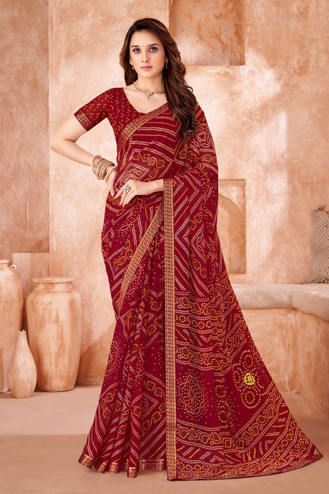 Red Color Bandhani Printed Chiffon Fabric Saree