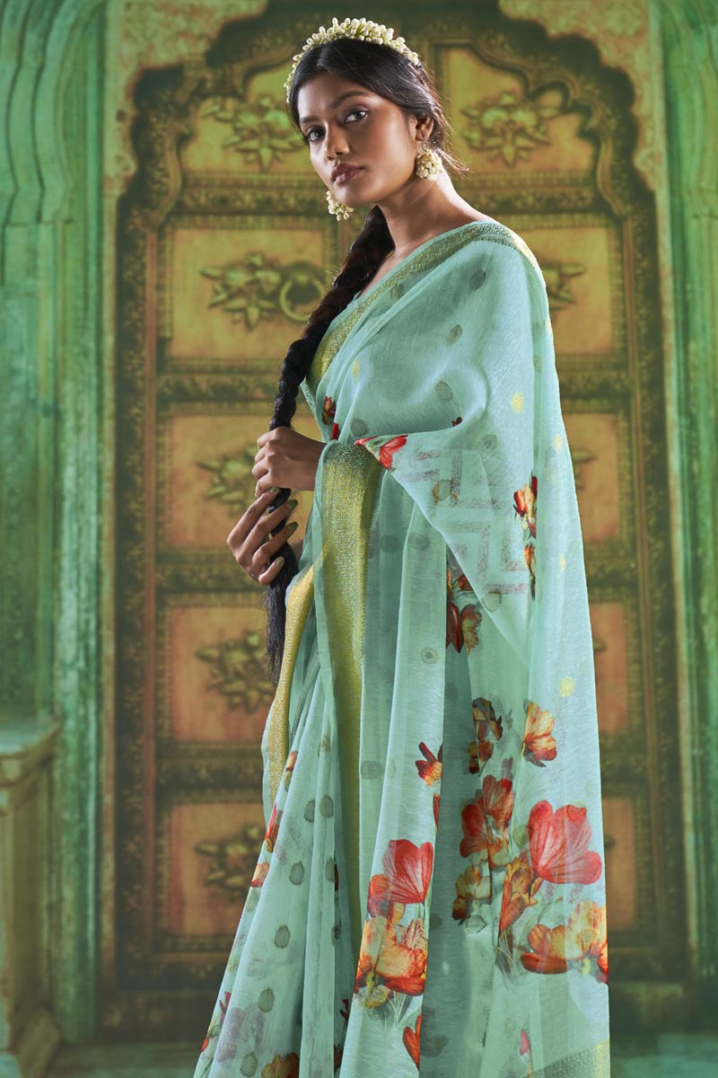 Light Cyan Function Wear Linen Trendy Saree