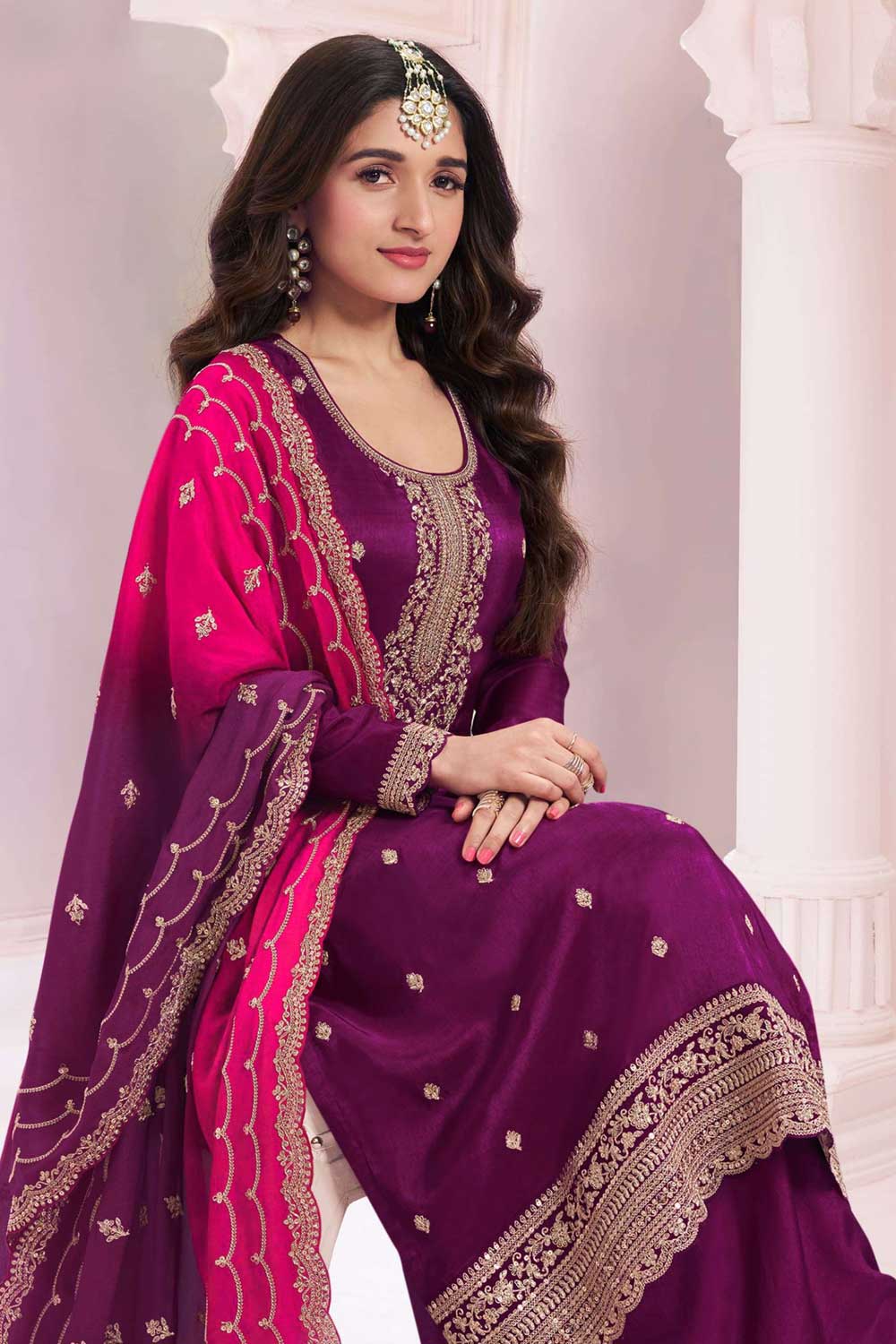 Step into sophistication with this stunning Palazzo Suit, perfect for functions and celebrations. The ensemble features a Heavy Vichitra top paired with a Heavy Santoon bottom for ultimate comfort and style. The look is completed with a luxurious Heavy Chinon Silk dupatta, adorned with Sequence Embroidery Stich Work that adds a touch of sparkle to your outfit. Note: Slight color variations may occur due to digital photography. Make every occasion shine with this exquisite palazzo suit!