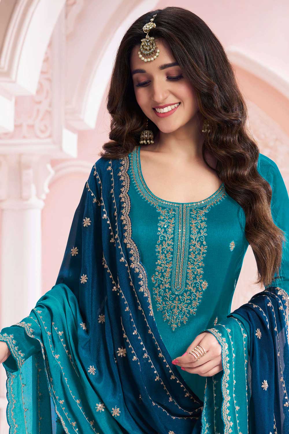 Nidhi shah Excellent Vichitra Fabric Teal Color Palazzo Suit