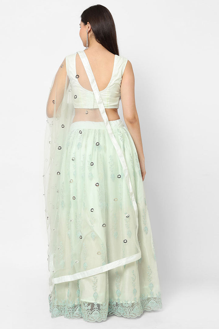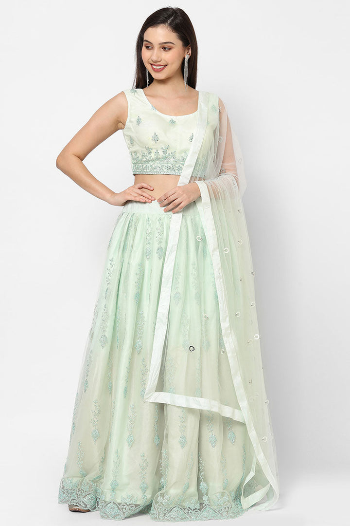 Net Fabric Sequins Work Wonderful Lehenga In Sea Green Color