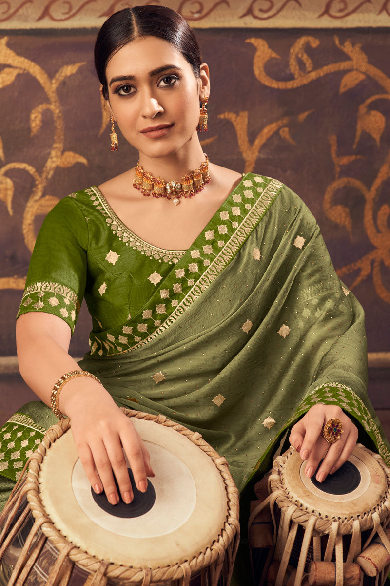 Chinon Fabric Function Wear Embroidered Engaging Saree In Sea Green Color