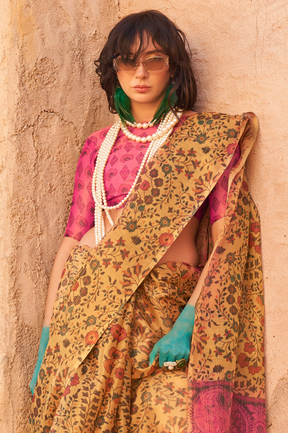 Delicate Mustard Color Handwoven Printed Tissue Fabric Saree