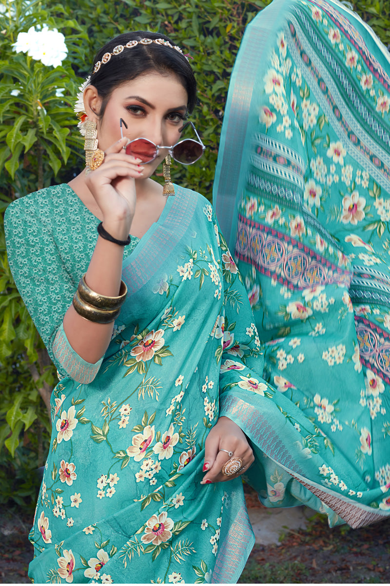 Engaging Cyan Color Cotton Cotton Silk Fabric Festive Look Saree