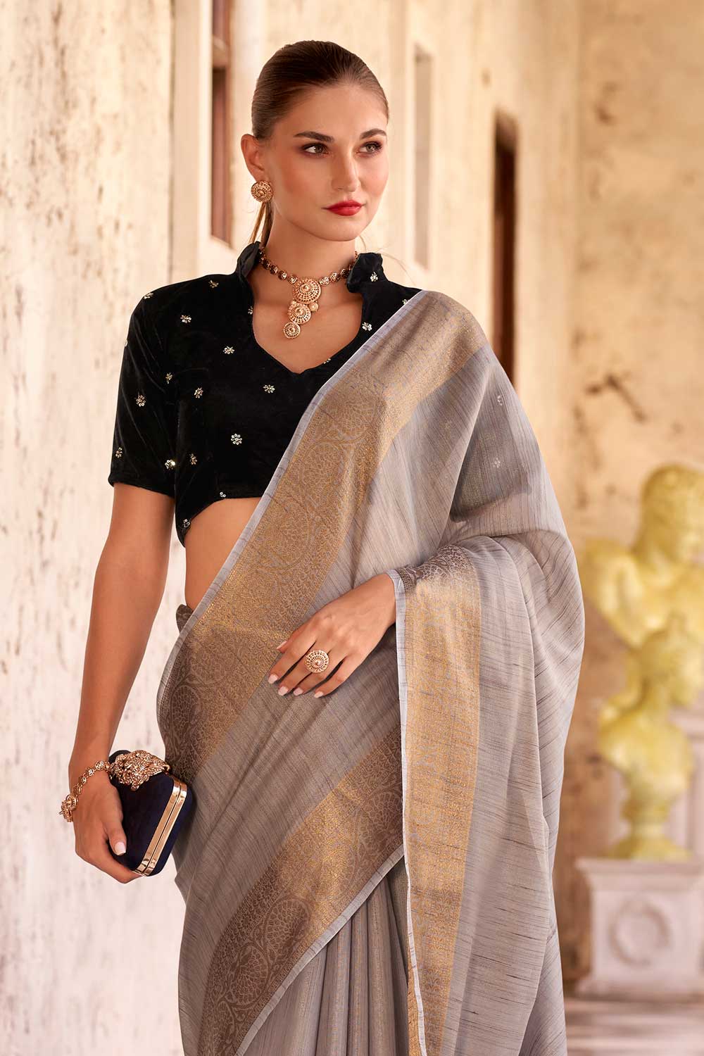 Imposing Fancy Linen Saree With Velvet Blouse In Grey Color