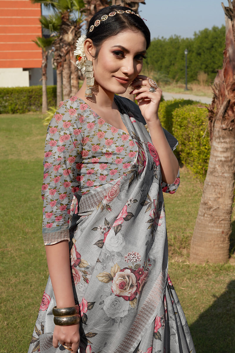 Radiant Grey Color Cotton Cotton Silk Fabric Festive Look Saree