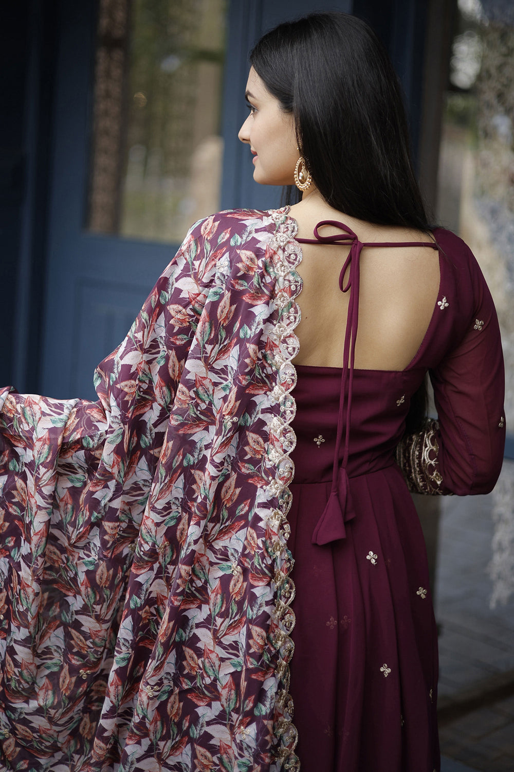 Persian Wine Color Georgette Fabric Readymade Long Anarkali Style Gown With Dupatta