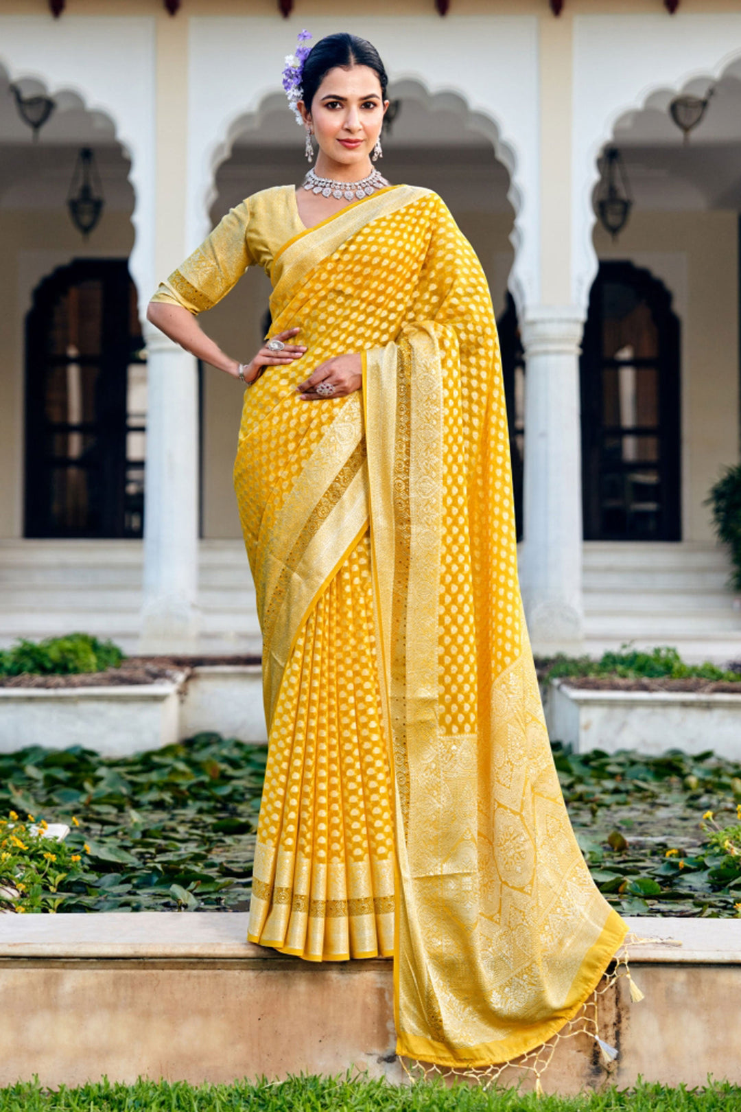 Weaving Work On Georgette Fabric Bewitching Saree In Yellow Color