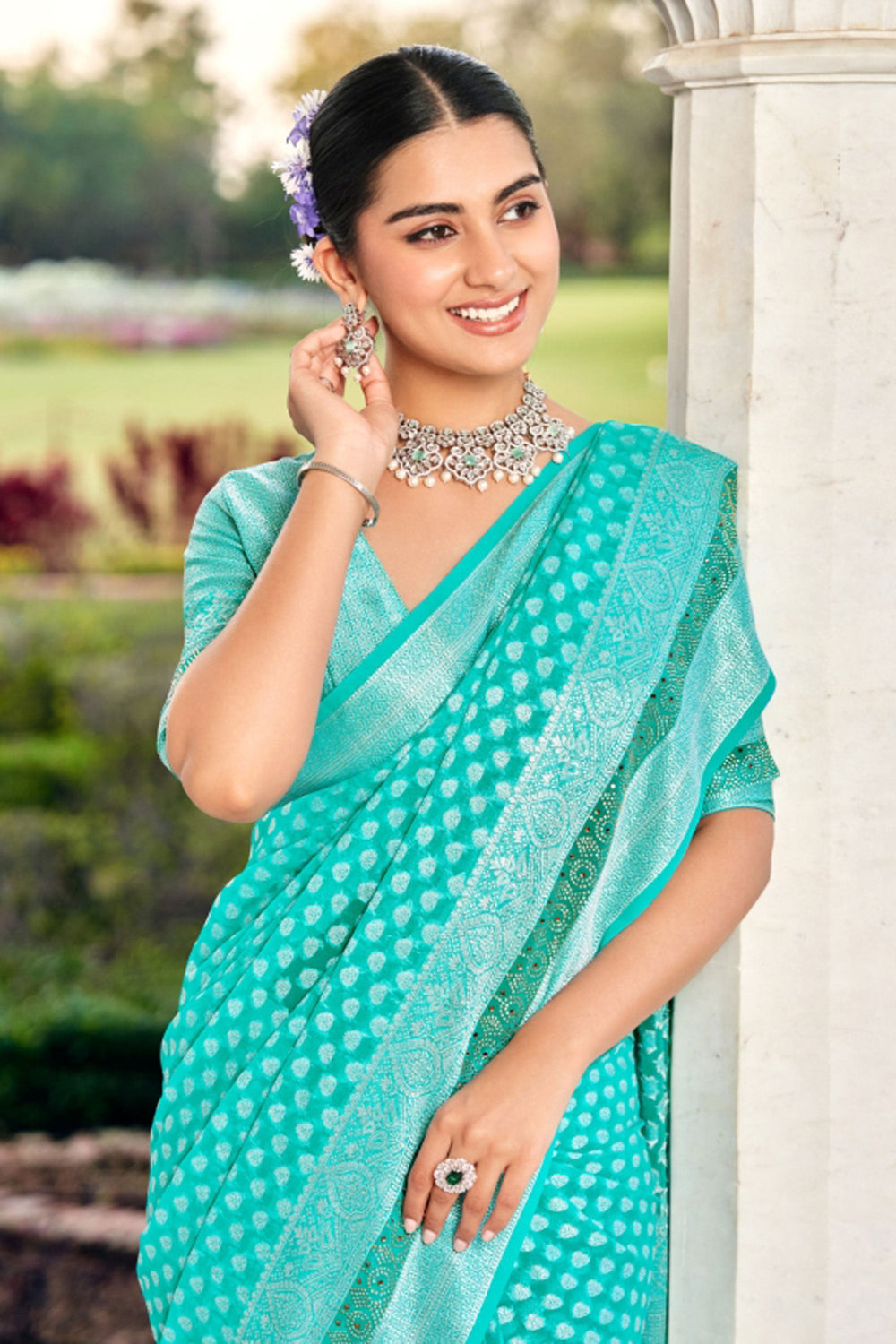 Cyan Color Georgette Fabric Coveted Saree With Weaving Work