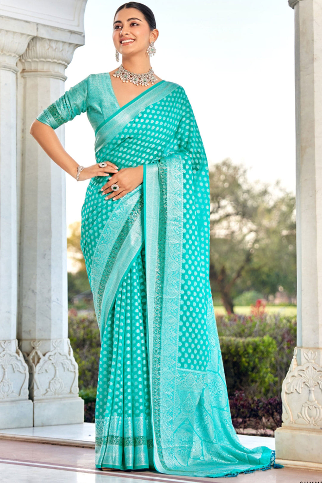 Weaving Work On Sea Green Color Georgette Fabric Princely Saree