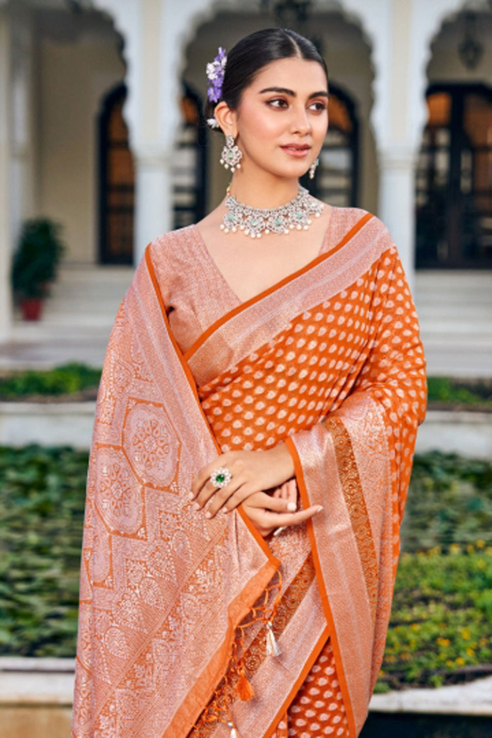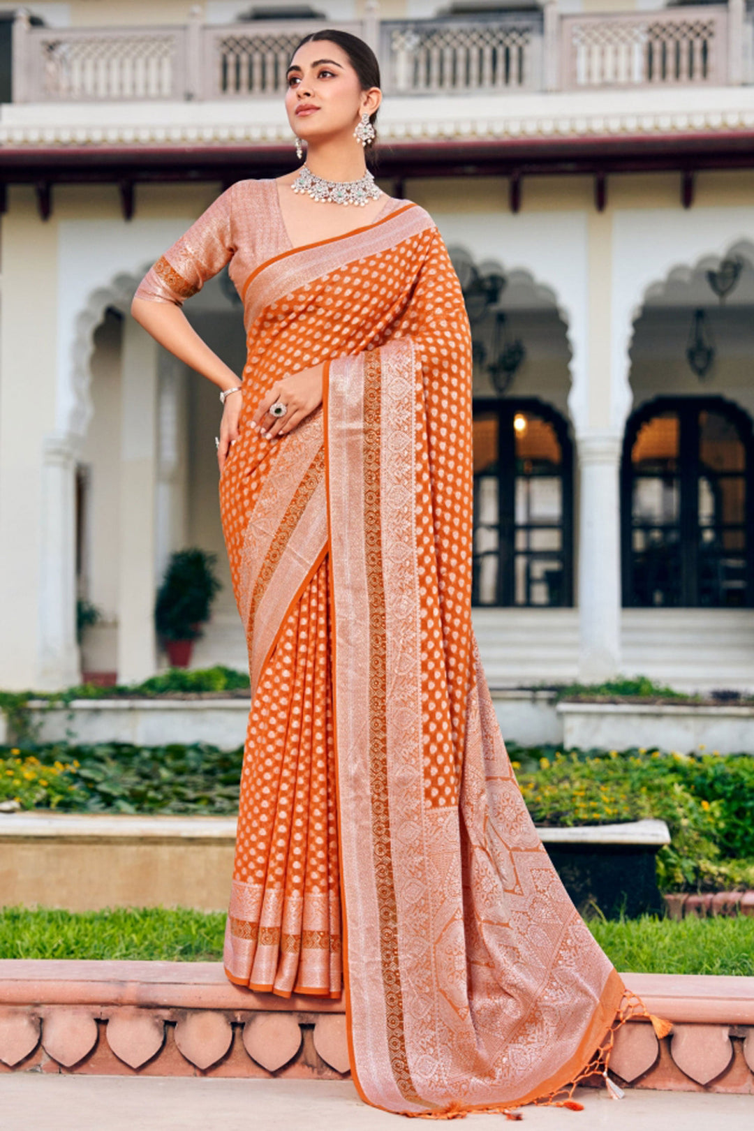 Georgette Fabric Orange Color Riveting Saree With Weaving Work