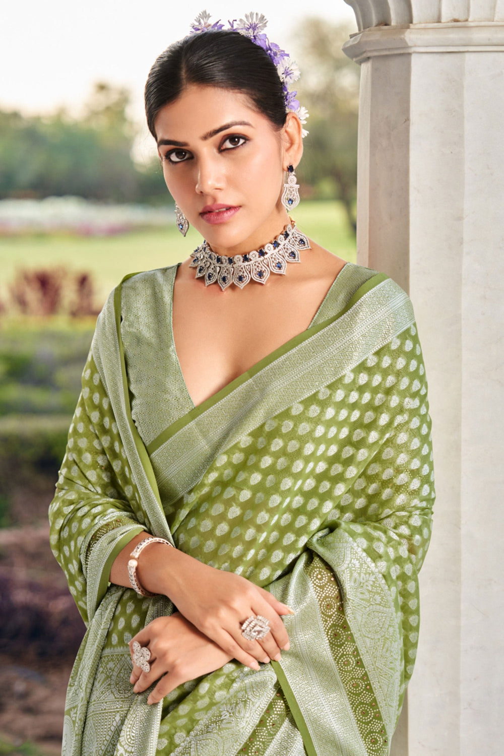 Green Chiffon Bandhani Printed Attached Banarasi Border Saree