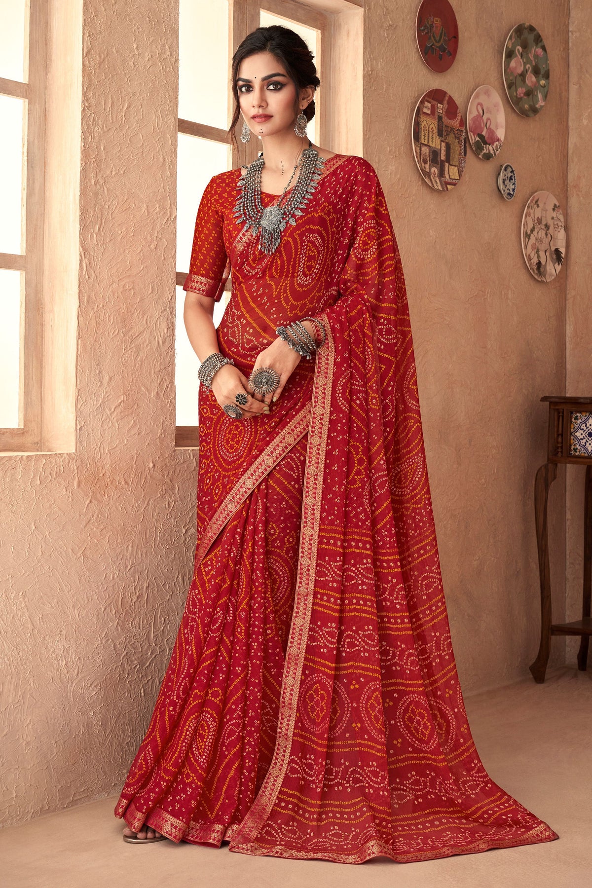 Chiffon Fabric Red Bandhani Printed Attached Banarasi Border Saree