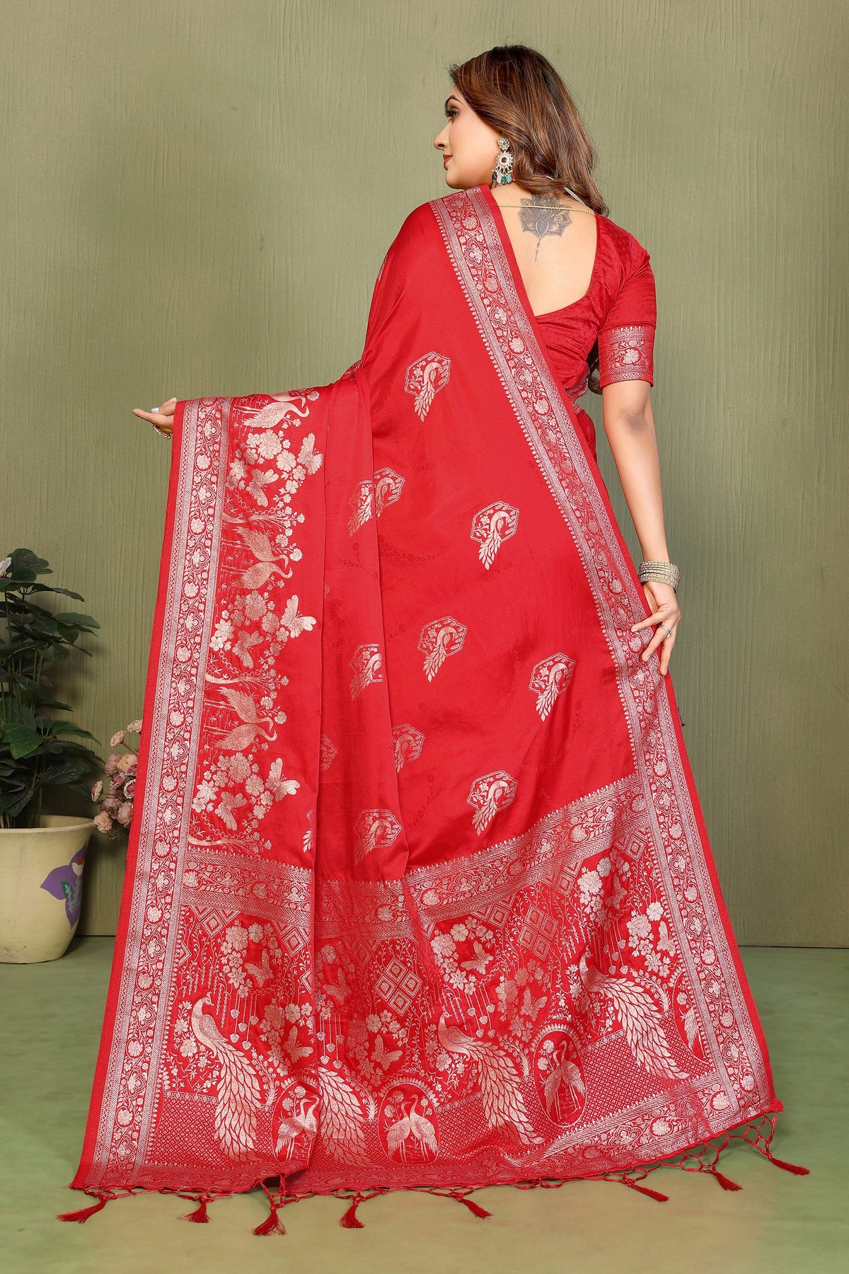 Delicate Red Color Weaving Work Satin Silk Saree