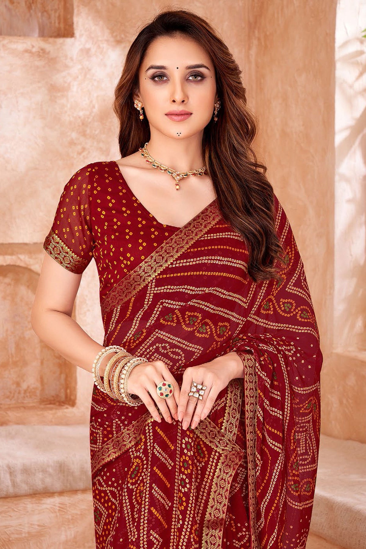 Red Color Bandhani Printed Chiffon Fabric Saree