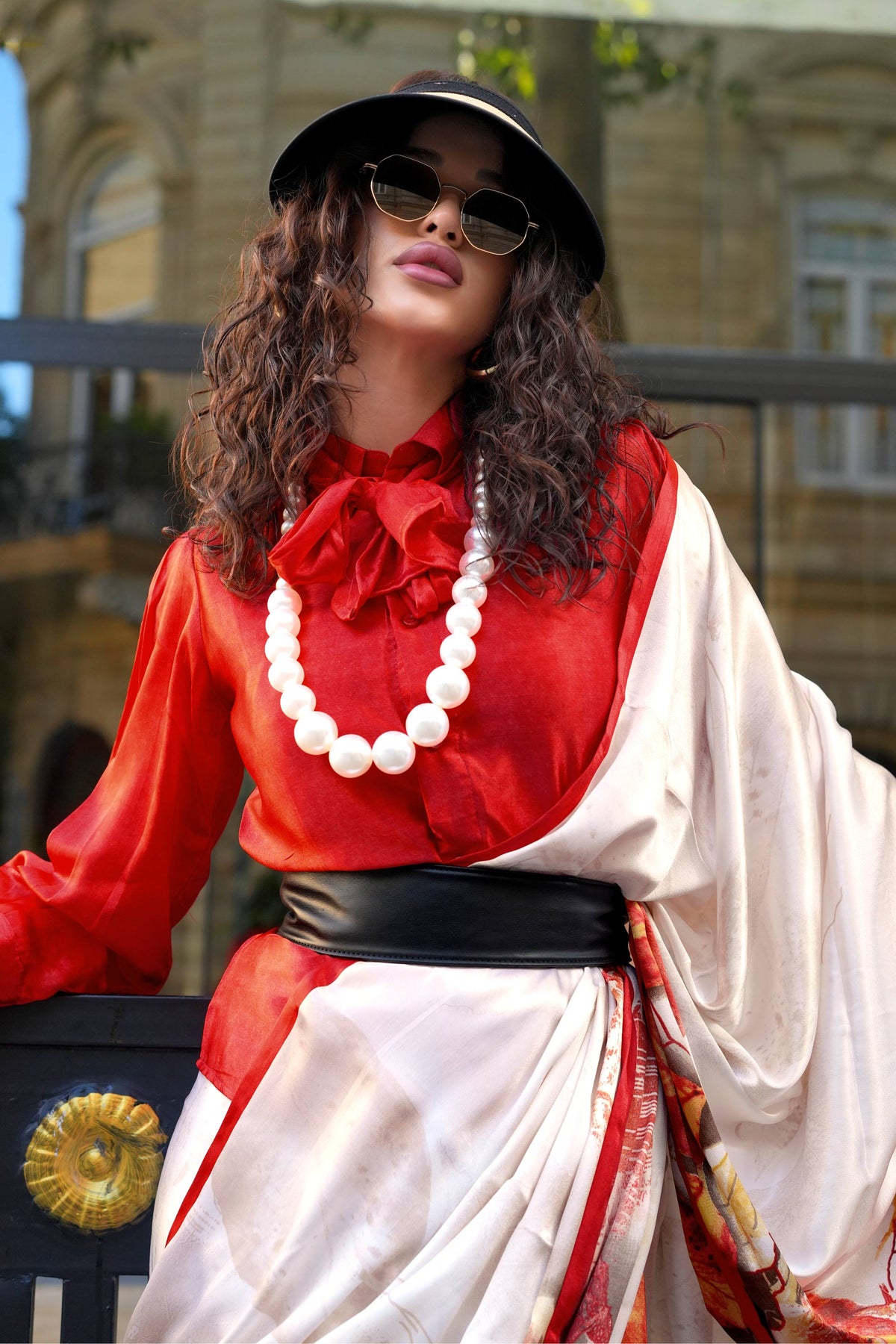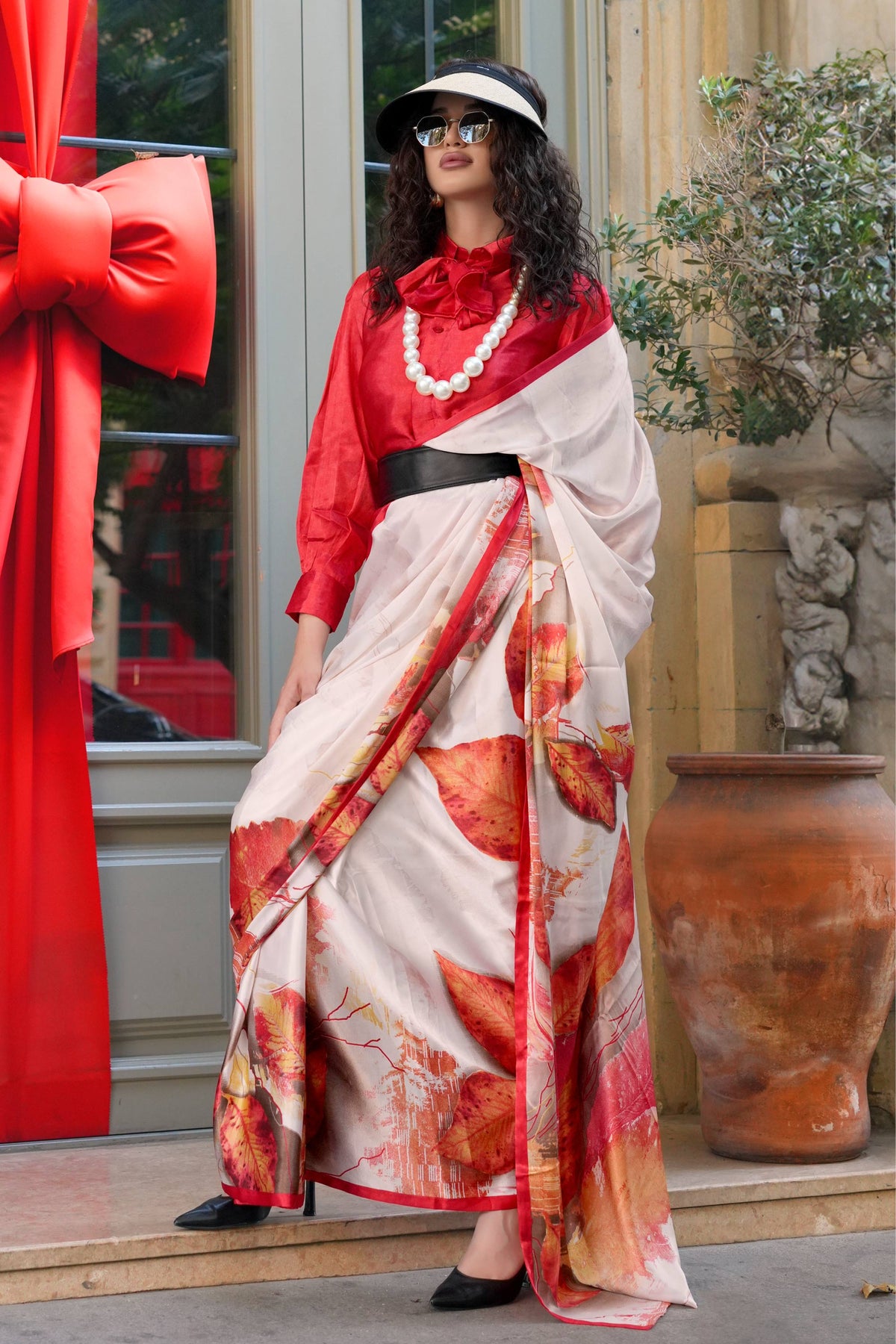 Embellished Digital Printed Work On Off White Color Satin Fabric Saree