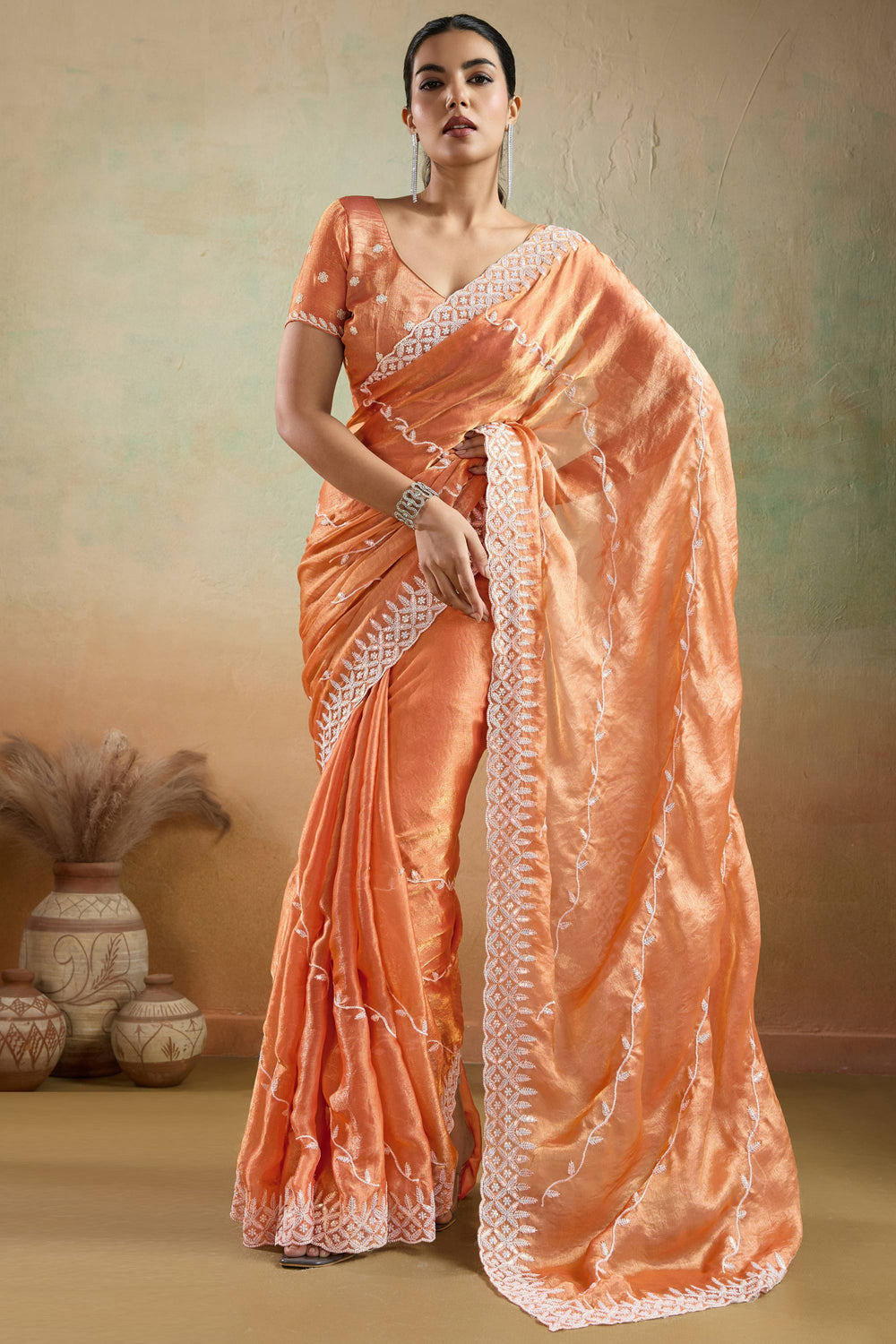 Tissue Fabric Thread Sequins Work Saree In Orange Color