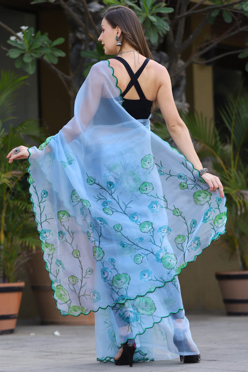 Appealing Cyan Color Organza Fabric Party Style Saree