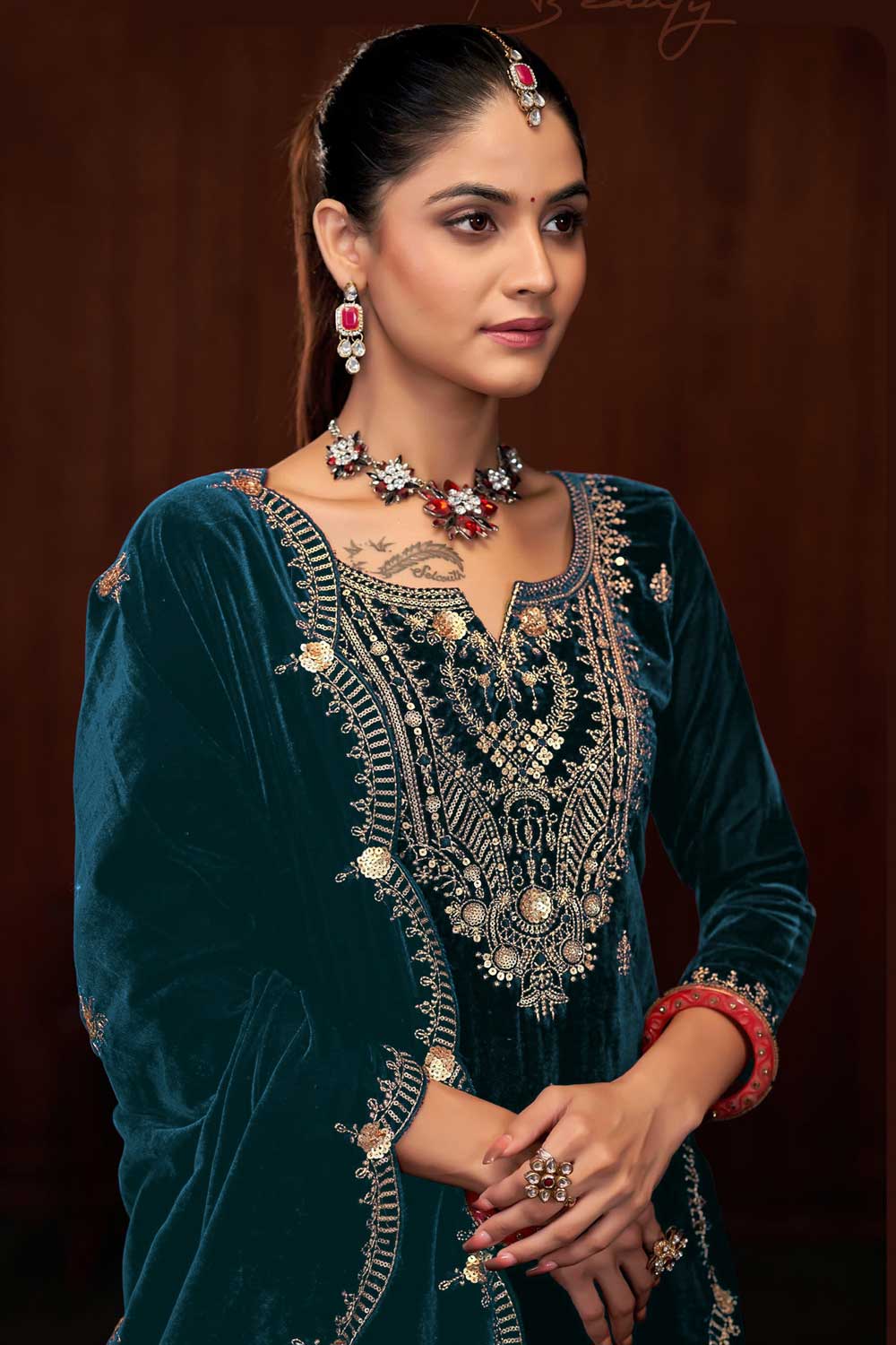 Classic Teal Color Function Wear Velvet Palazzo Suit