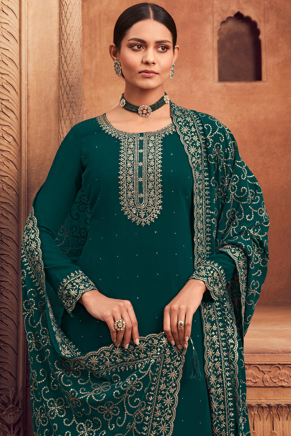 Embroidered Festive Wear Palazzo Salwar Kameez In Georgette Fabric Teal Color