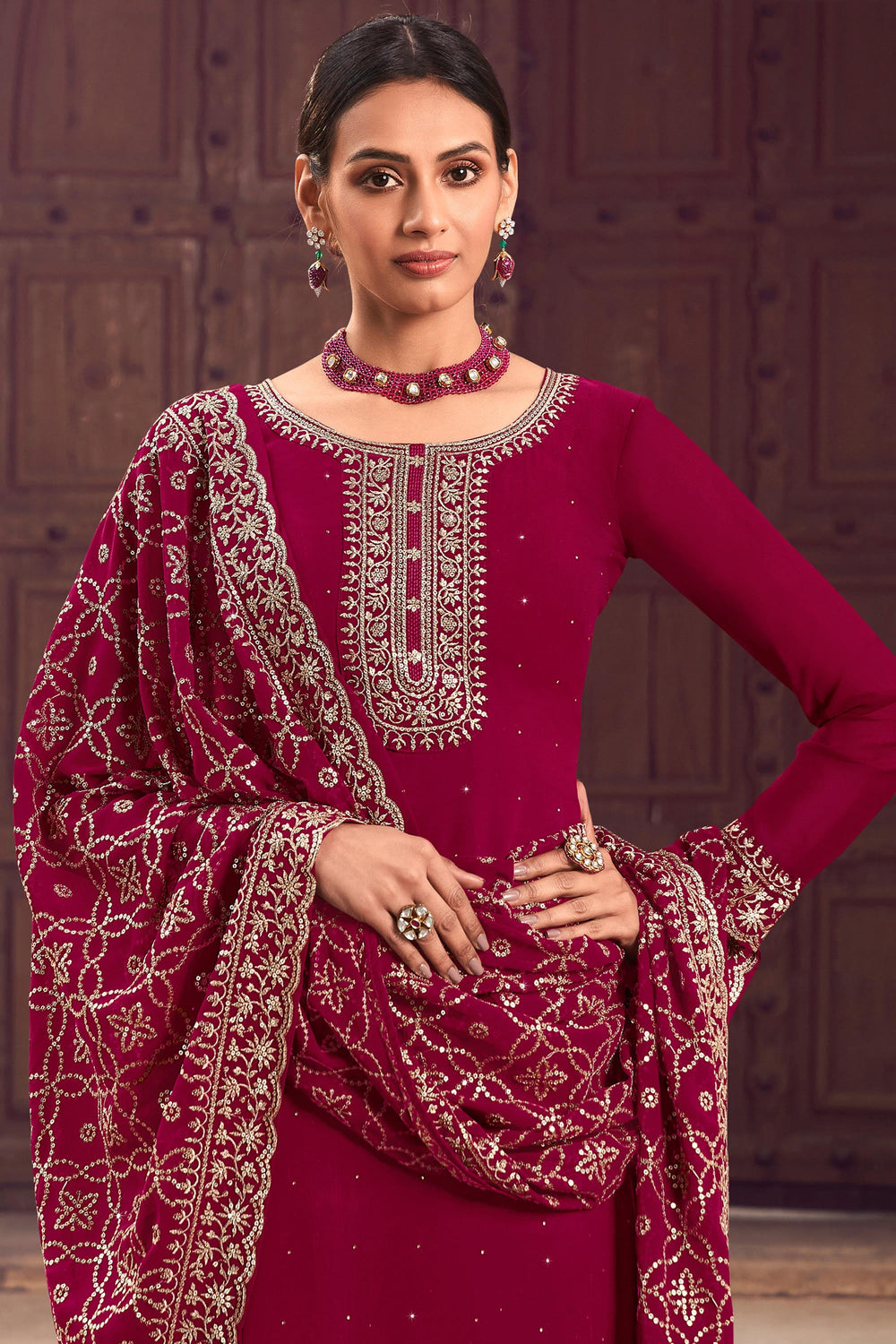 Magenta Color Georgette Fabric Fancy Embroidered Function Wear Palazzo Salwar Kameez