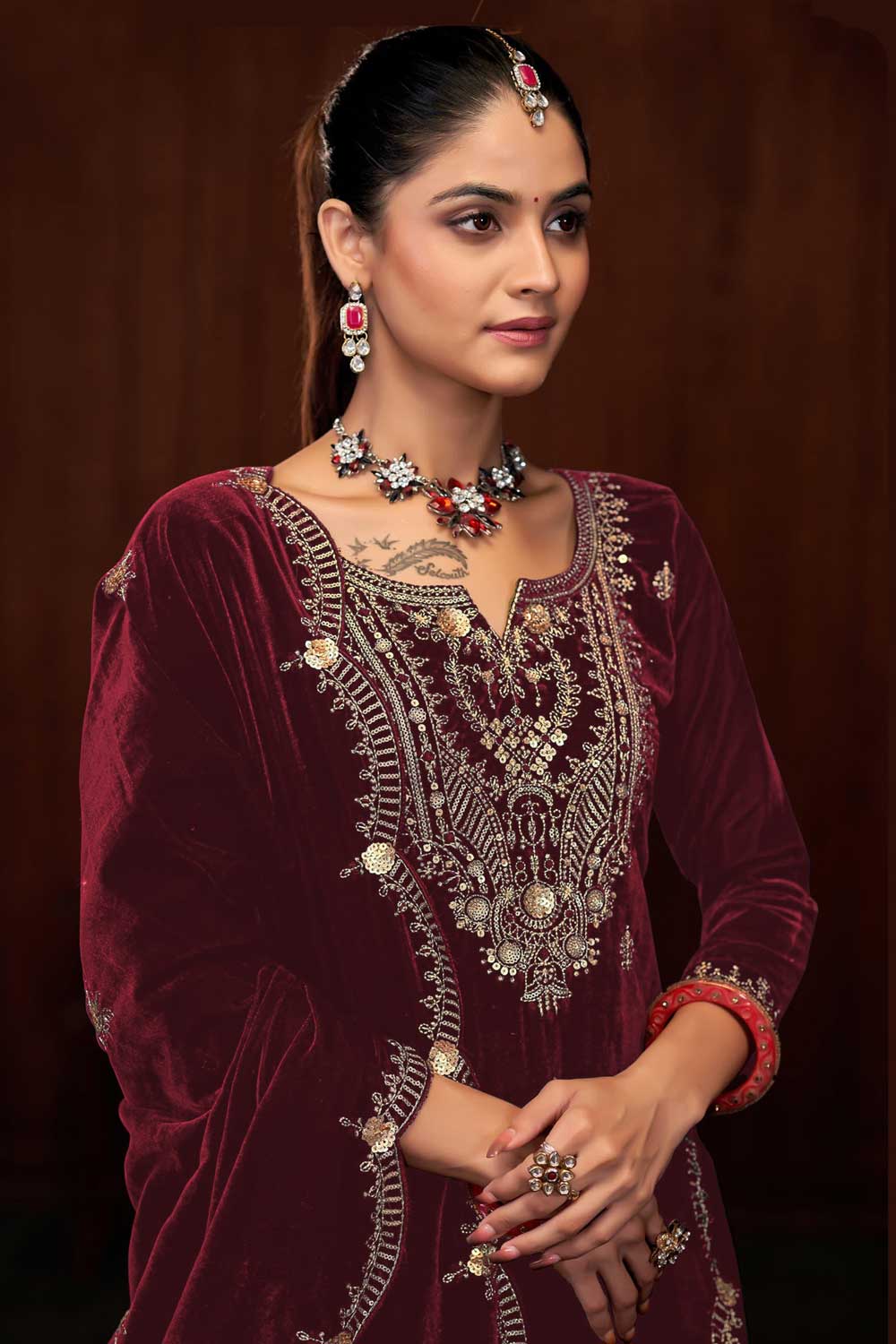 Maroon Color Function Wear Winsome Velvet Palazzo Suit