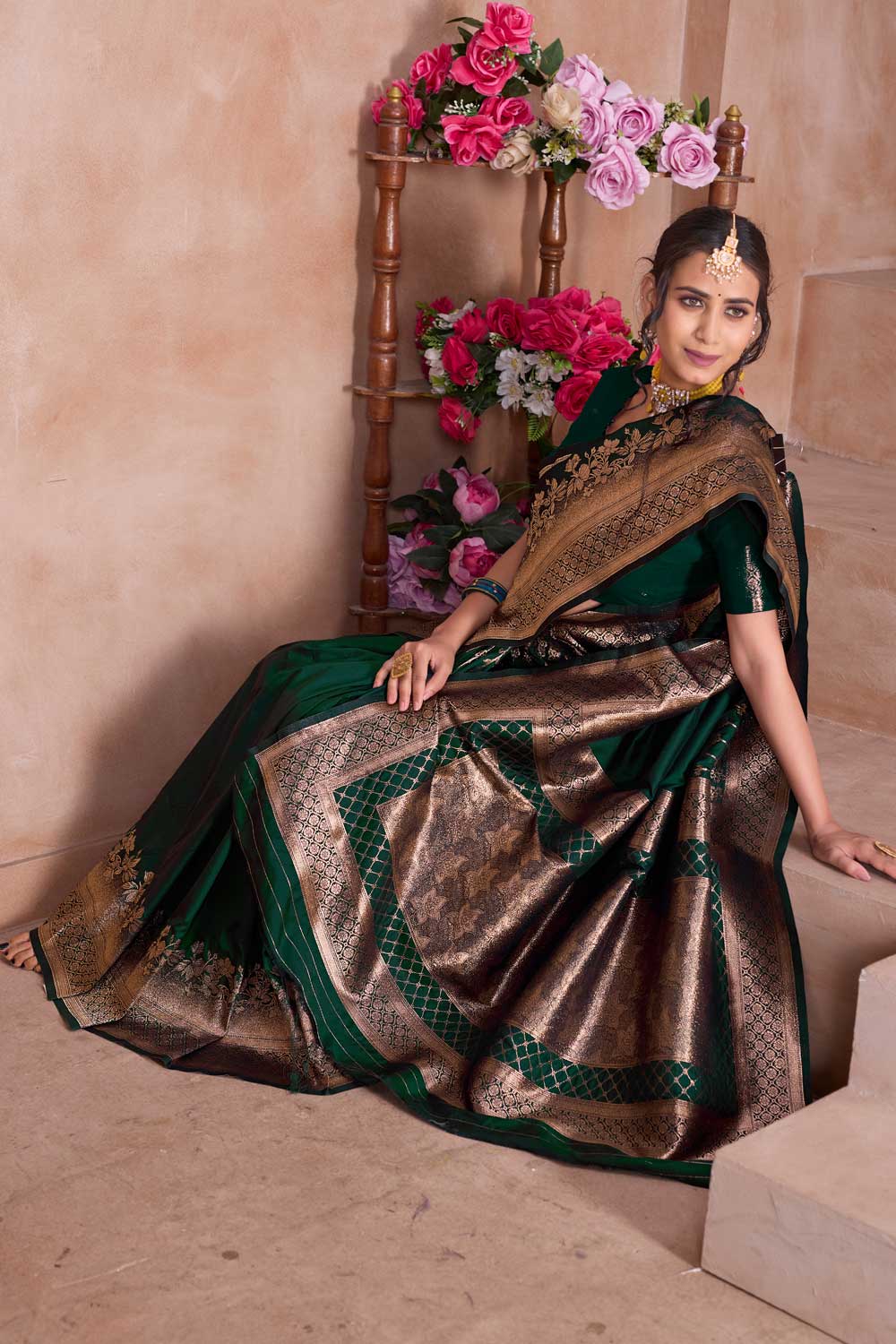 Art Silk Weaving Banarasi Jari Work Saree In Dark Green Color