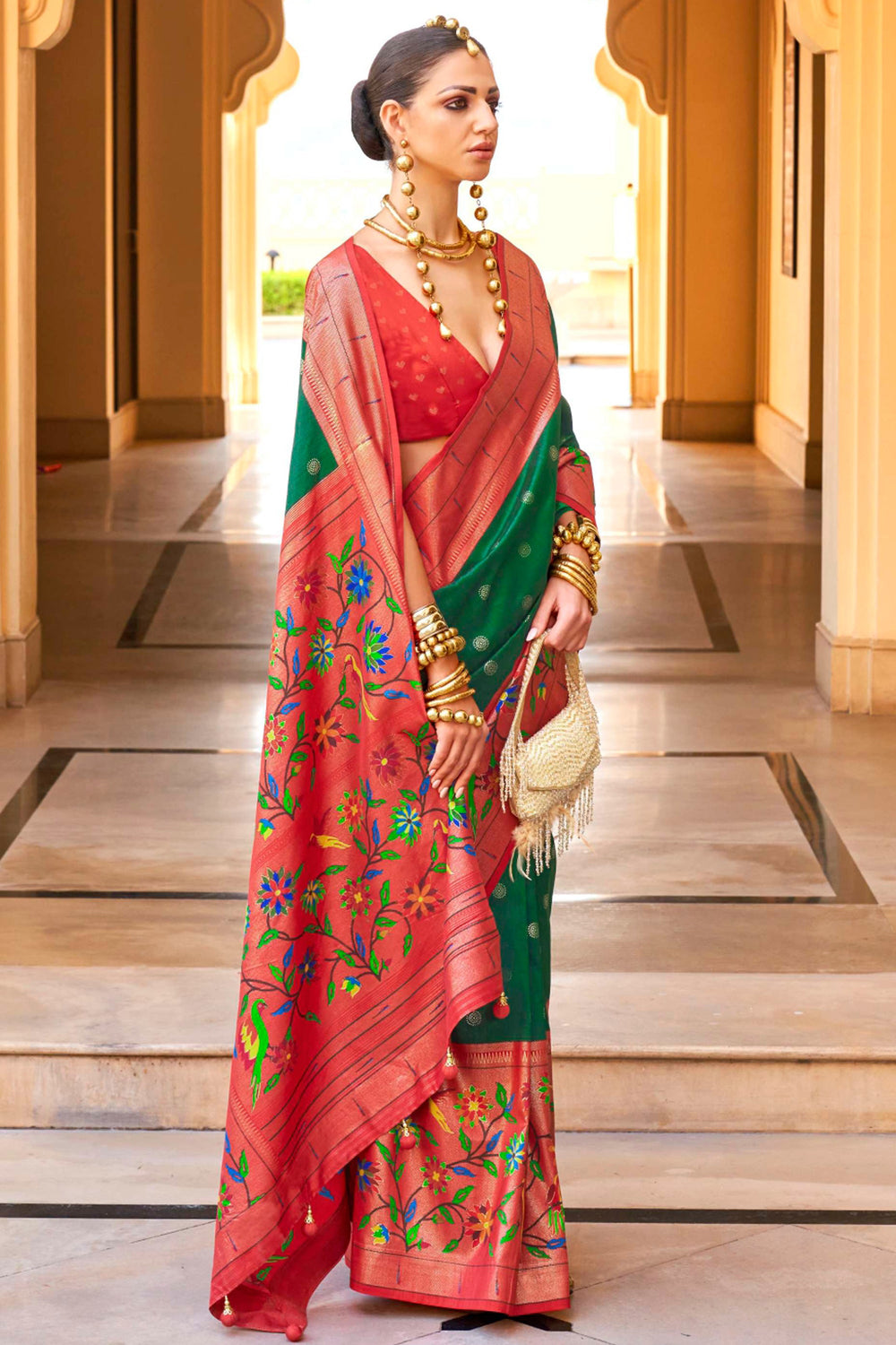 Beguiling Paithini Printed Design On Green Color Art Silk Fabric Saree