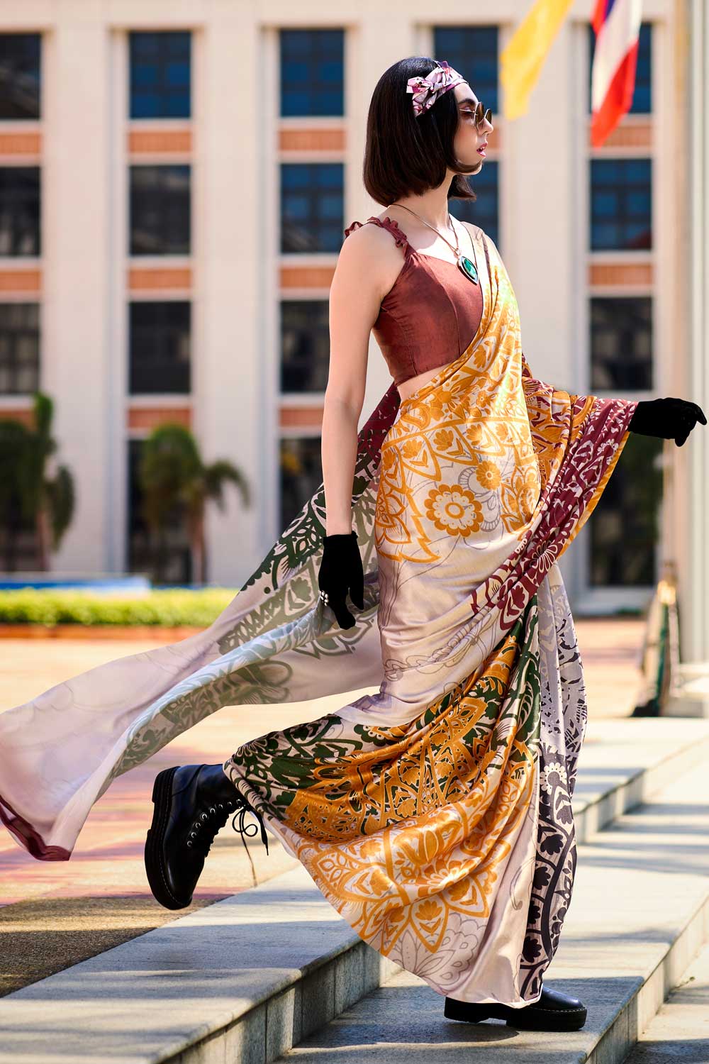 Creative Printed Work On Multi Color Satin Fabric Saree