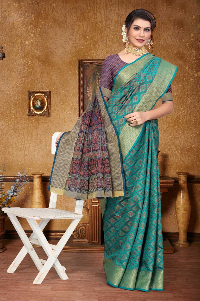 Festive Wear Art Silk Fabric Teal Color Engaging Patola Style Saree