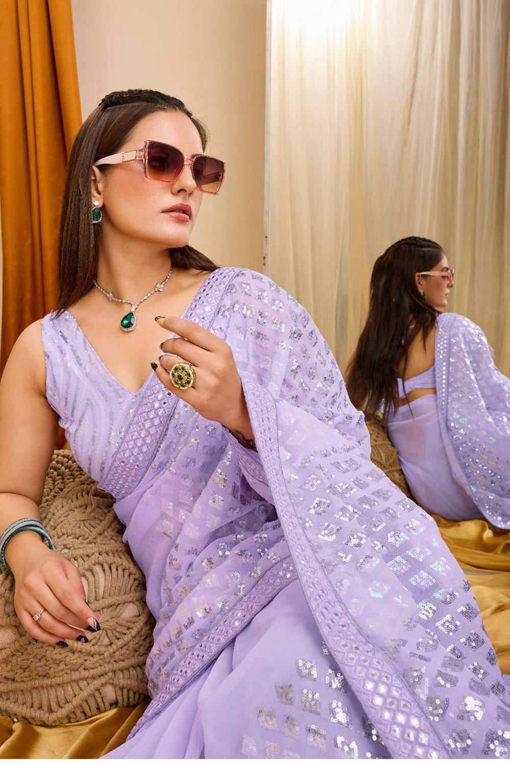 Radiate elegance in our Designer Georgette Saree. Adorned with delicate sequins work, this saree is perfect for special functions. Elevate your style effortlessly!