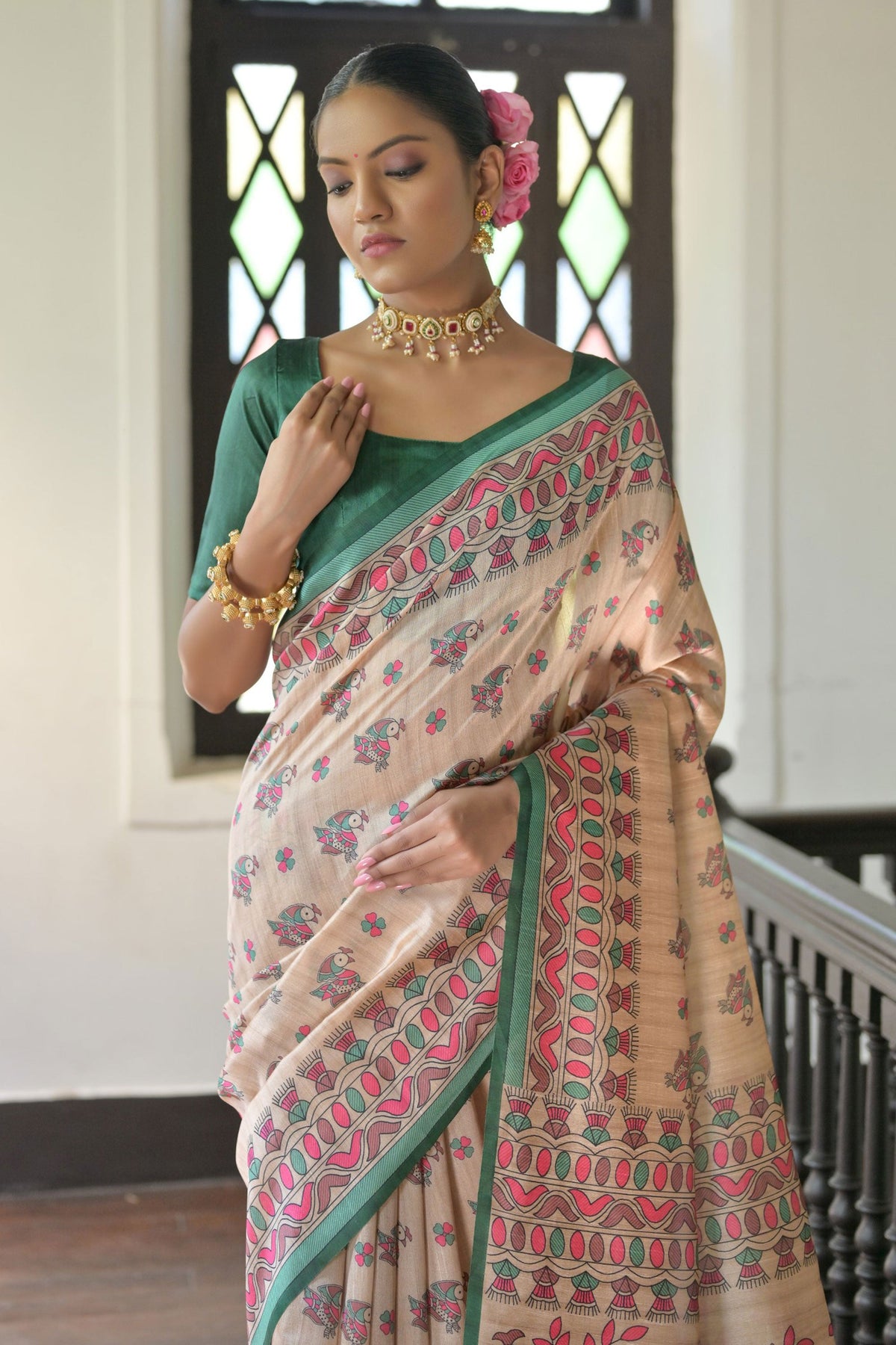 Incredible Tussar Silk Fabric Beige Color Saree With Green Blouse