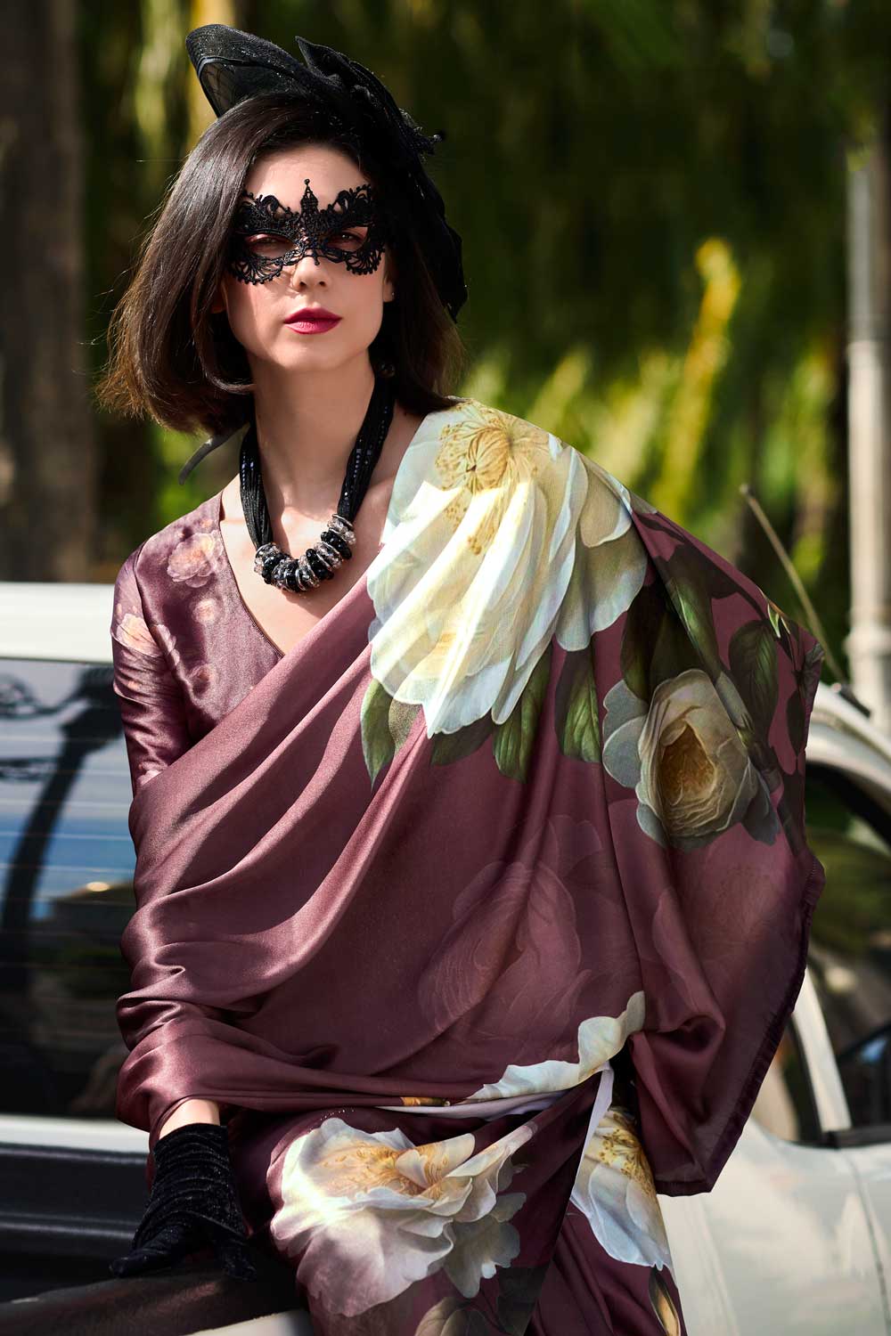 Printed Work On Brown Color Sober Saree In Satin Fabric