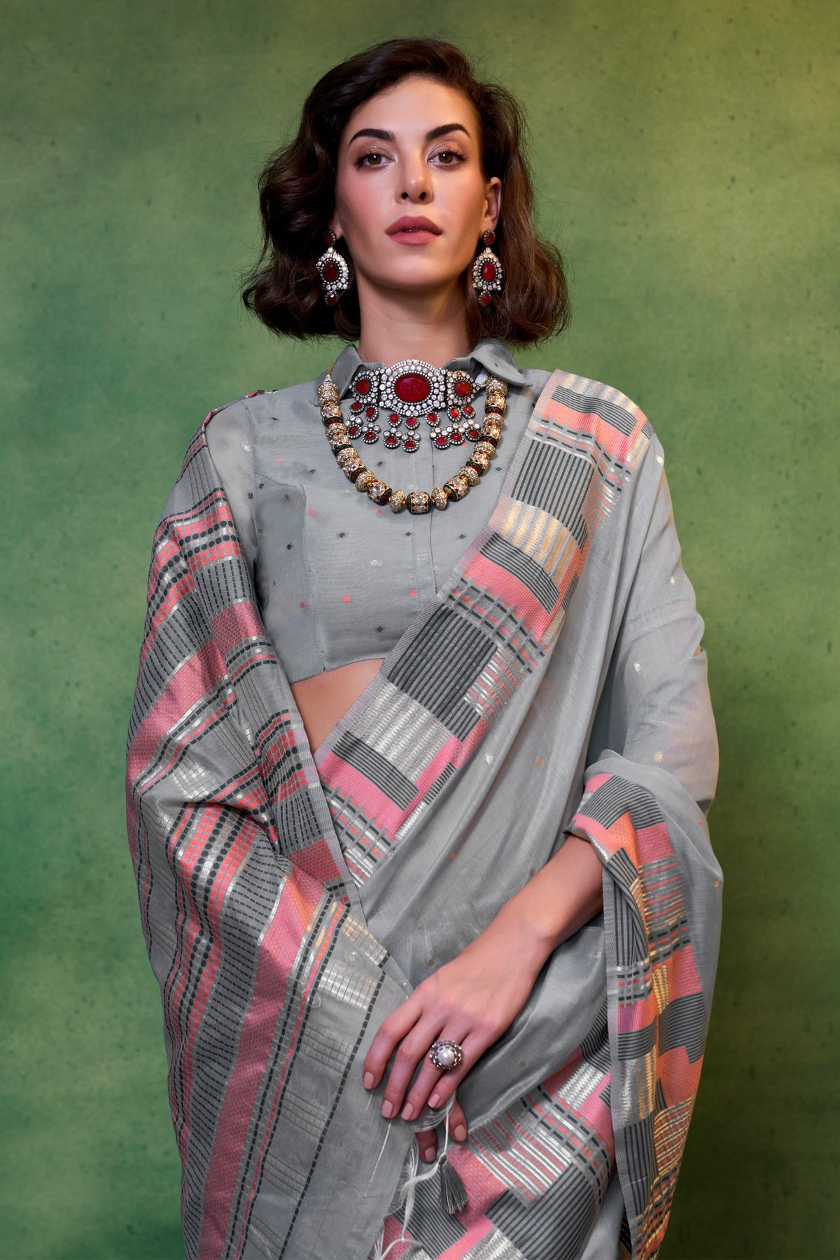 Alluring Grey Color Handloom Weaving Fancy Cotton Saree