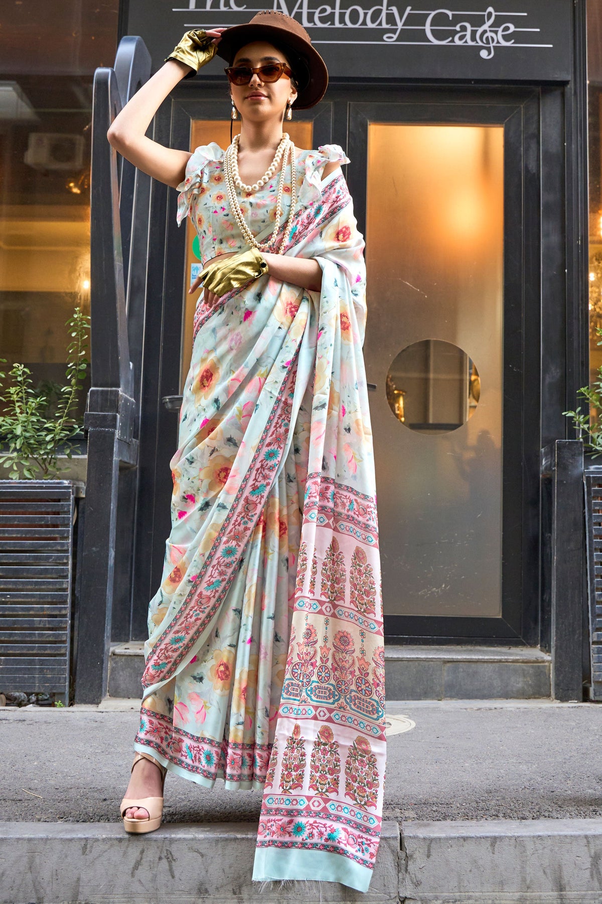 Art Silk Fabric Light Cyan Color Riveting Saree With Printed Work