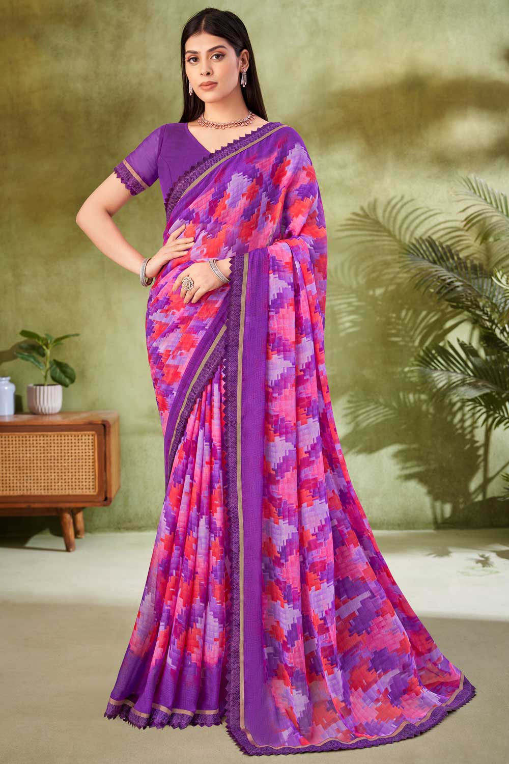 Classic Purple Color Printed Saree In Chiffon Fabric