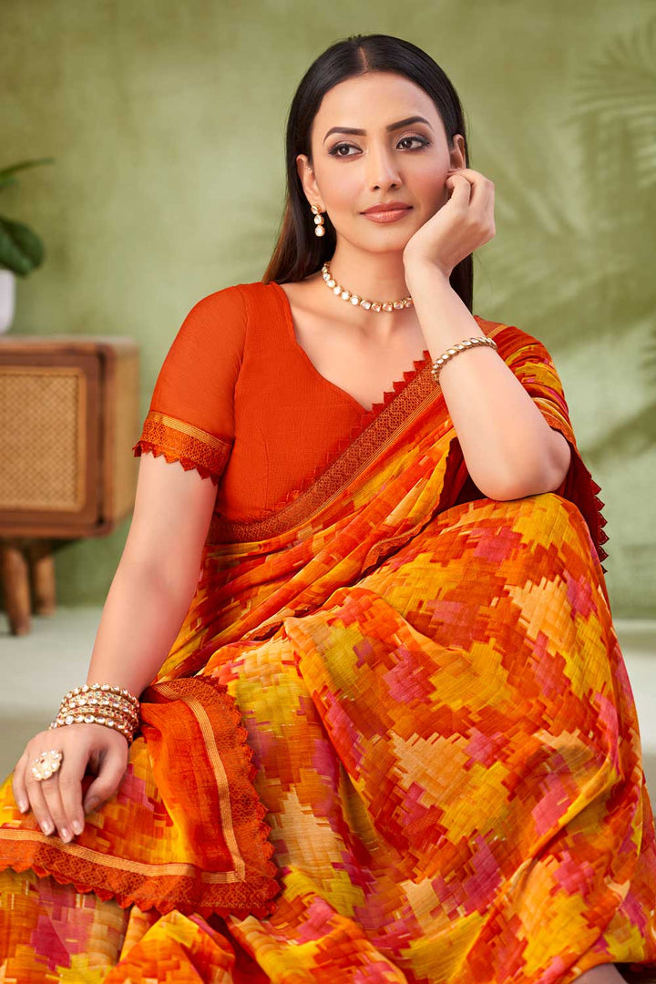 Engaging Orange Color Chiffon Fabric Printed Saree