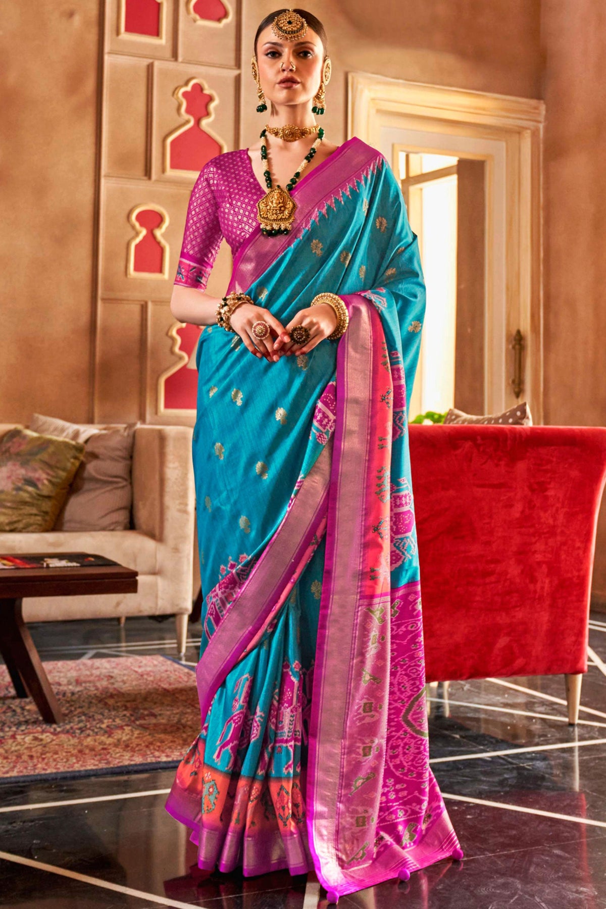 Step into the spotlight with this exquisite Traditional Art Silk Saree, adorned with mesmerizing Patola prints. Designed to perfection, this saree seamlessly blends the richness of heritage with contemporary elegance, making it an impeccable choice for any function wear.