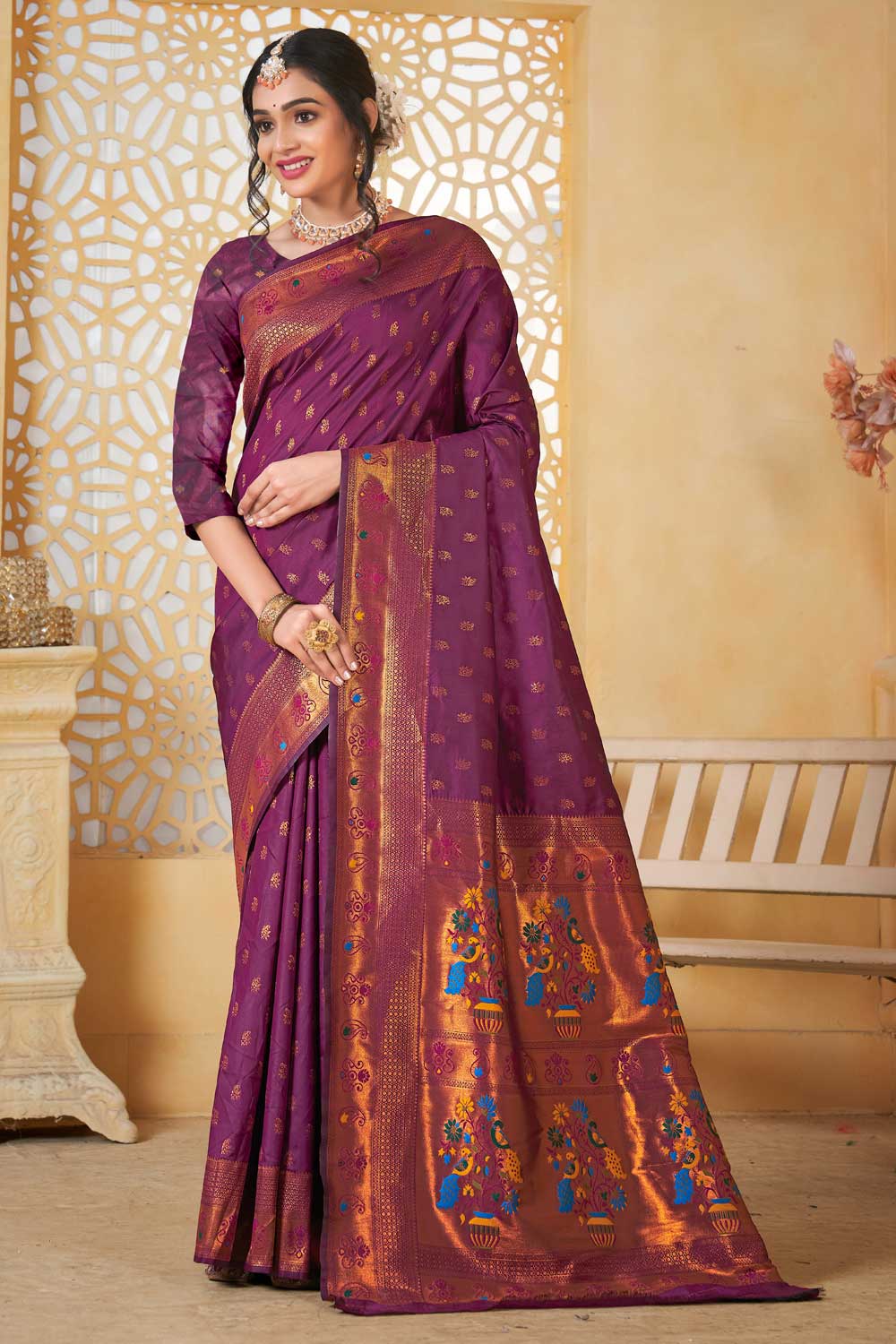 Drape yourself in timeless elegance with this exquisite traditional pethani silk saree, crafted to celebrate the essence of Indian heritage. Woven from rich pethani silk, this saree offers a luxurious texture that drapes beautifully, radiating opulence with every fold. The highlight lies in its Fancy Pallu and Border, adding a regal touch that effortlessly elevates your festive look. Whether you're attending a puja or celebrating with loved ones, this saree is a graceful companion that blends tradition with refined charm. Perfect for: Festivals, traditional gatherings, and cultural celebrations. Note: Due to digital photography, slight color variations may occur.