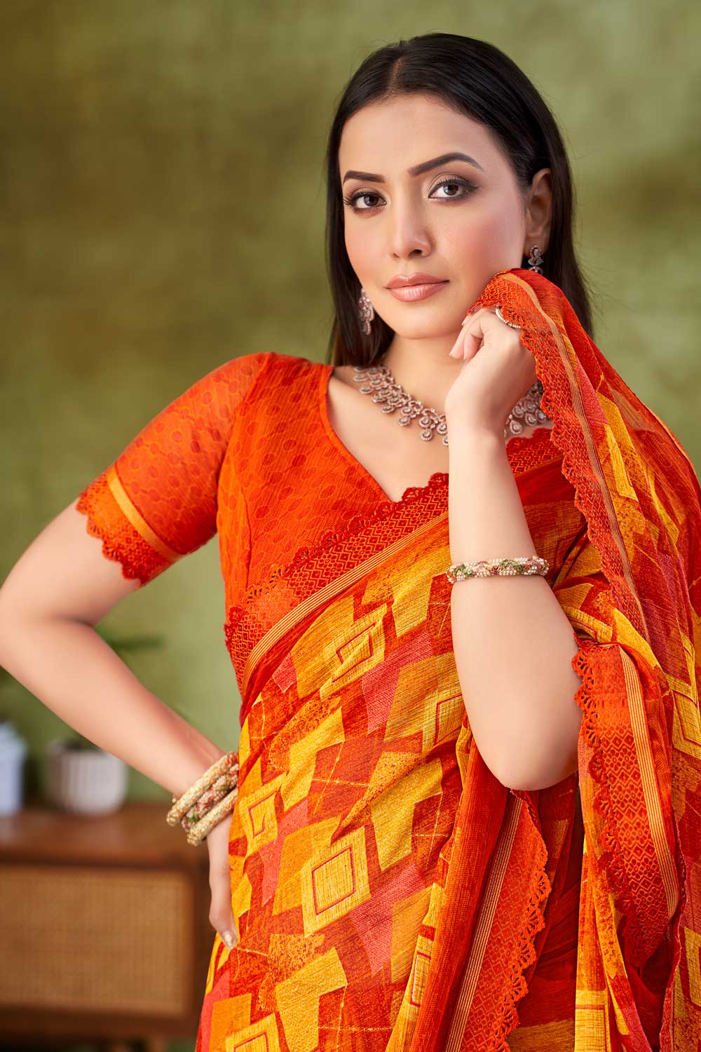 Sober Orange Color Chiffon Fabric Printed Saree