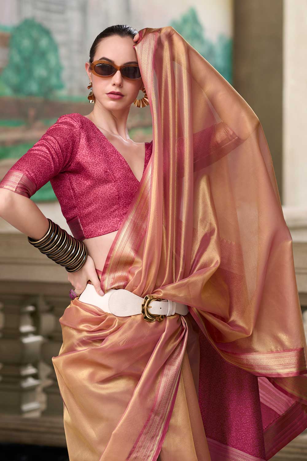 Weaving Work On Awesome Tissue Silk Fabric Saree In Peach Color